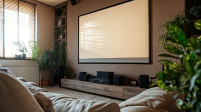 Home theater room with projection screen, plants, and comfy seating
